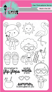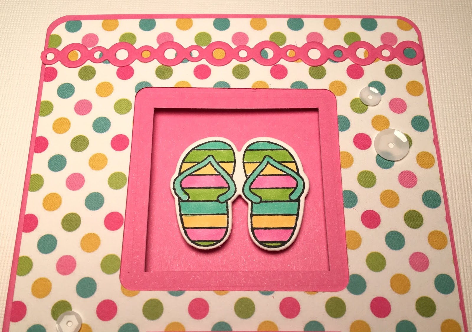 4. Stamp the Flip Flops from the new release set Sending Waves. Color with copics: Y21 – YG25 – BG34 – RV55.  Use coordinating die to cut out flip flops and pop into the window