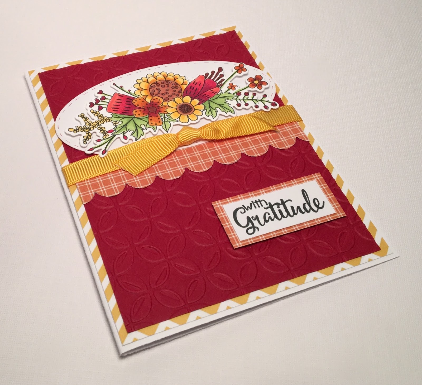 It is Pam crafting with you on the Pink and Main Blog! Today I am using the Gratitude stamp set again! I just love the sentiments. They are so perfect for the next major holiday Thanksgiving!! The bright warm colors are my favorite palette to work with.