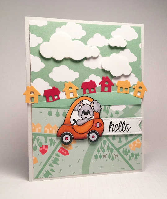 5. Cut the clouds and banner stamp Hello on banner (Pink and Main Spring Train)