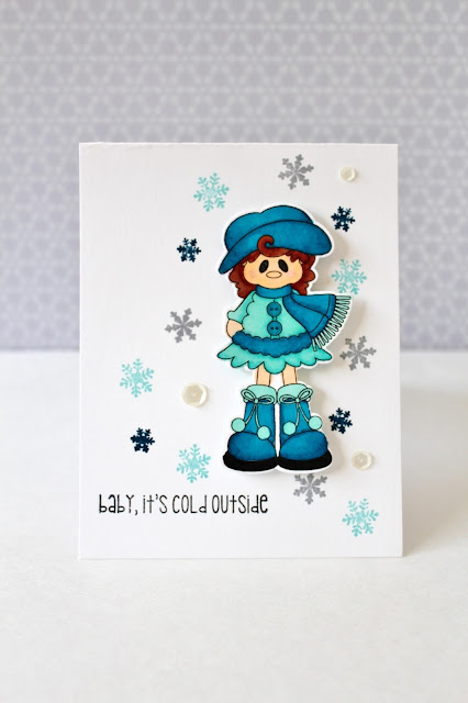 Scarlet is stamped on white cardstock and cut out using the coordinating die. I colored the image with a variety of markers. To form the card, I simply stamped the sentiment onto the card. I randomly stamped snowflakes (from the Scarlett and Cocoa Cafe stamp sets). The girl is attached using a foam dot. To fill in some of the empty spaces, I used some white sequins.