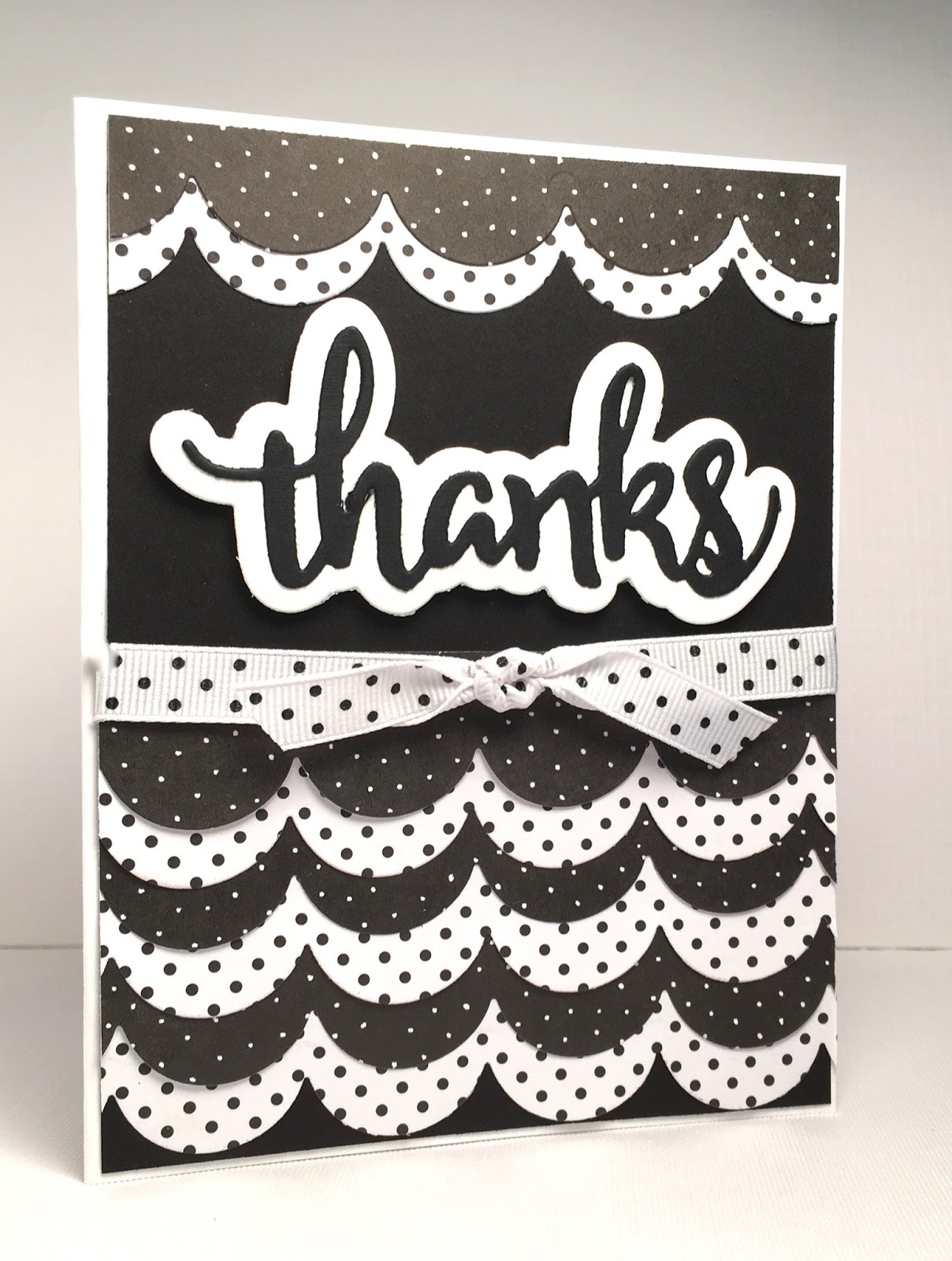 I just used the scallop die on the black and white polka dot paper and created my scallop design. I added the ribbon. Then I cut out the shadow for the thanks in white and the word in black as you card see. It was a pretty quick and easy card!