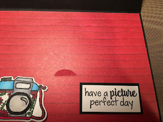 Cut out your designer paper, the red base is 5 1/4 x 4. Then cut 2 pieces of the camera print