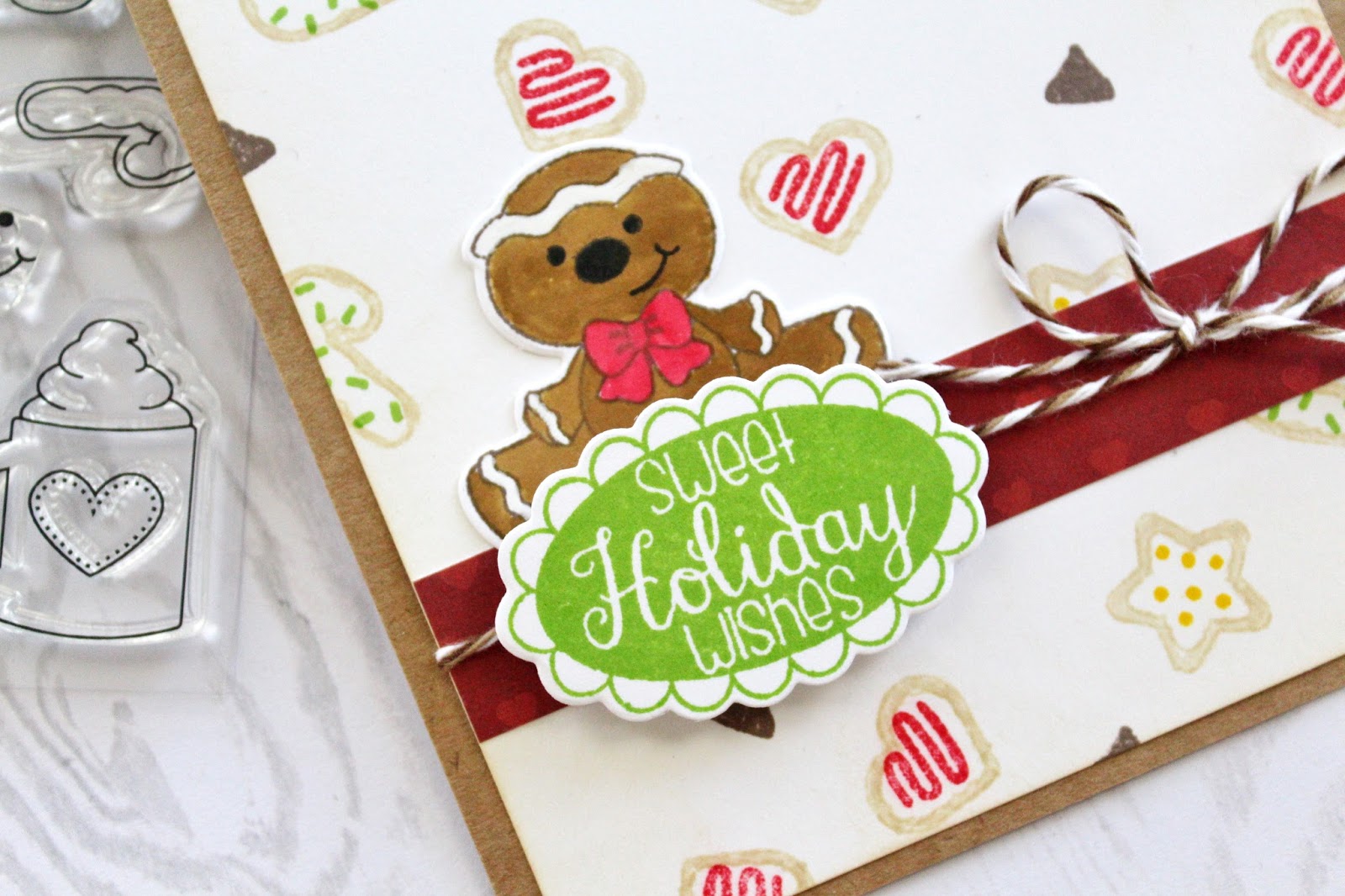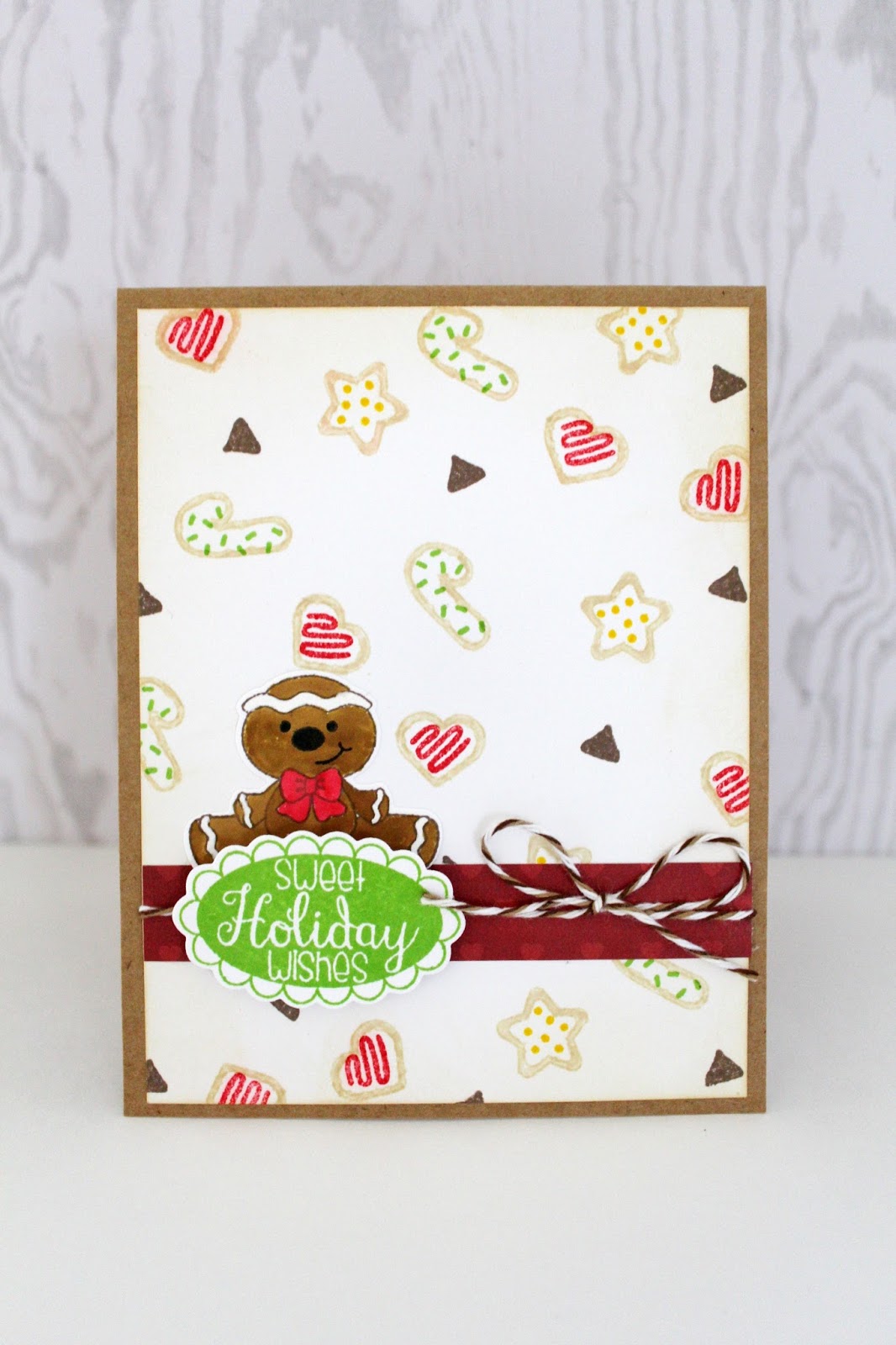 The stamp set also includes a fancy sentiment. I stamped this in green and used the matching dies to cut it out. At the last minute, I decided to add a fun gingerbread man. The image is stamped in a darker brown and colored in with distress inks. This image is also cut out using the matching die. I added a piece of twine as the final touch when assembling the card.