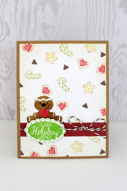 I fell in love with the different cookie stamps included in the set. I wanted to make a card that highlighted the images. I decided to use the no-line technique to color in the cookies. The cookies are stamped in a light brown distress ink. I colored in the cookie outline with the matching ink. I love that there are individual stamps to decorate the cookies. I used red, yellow, and green to decorate the top of the colors.