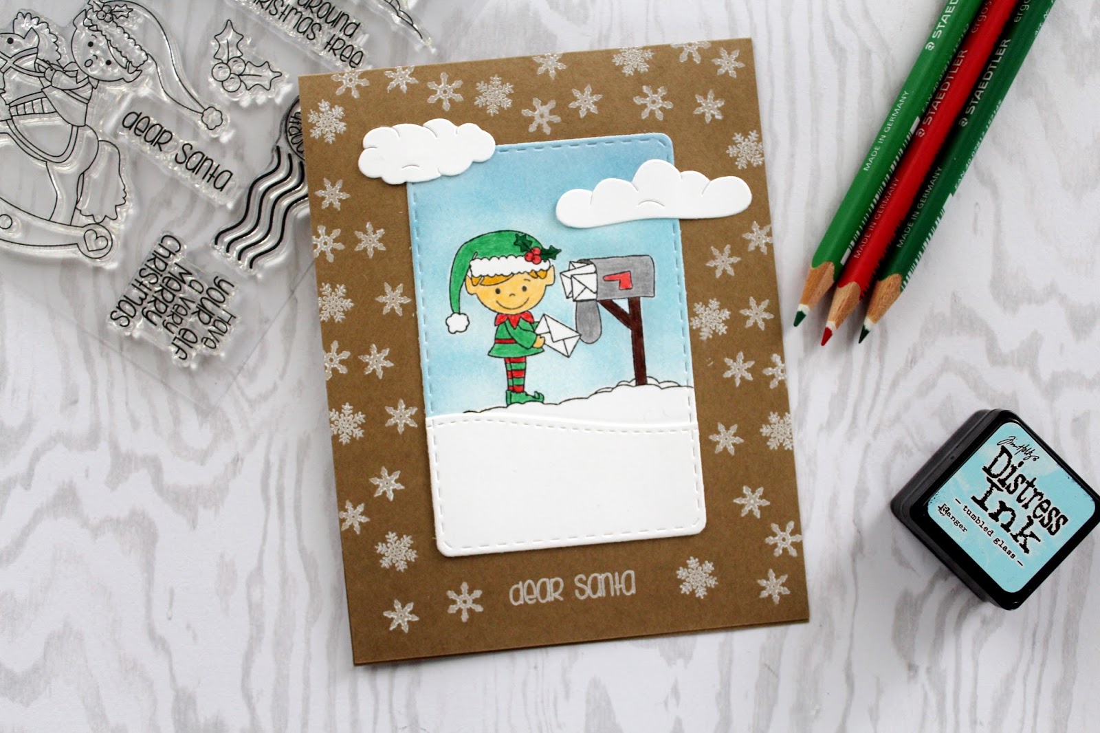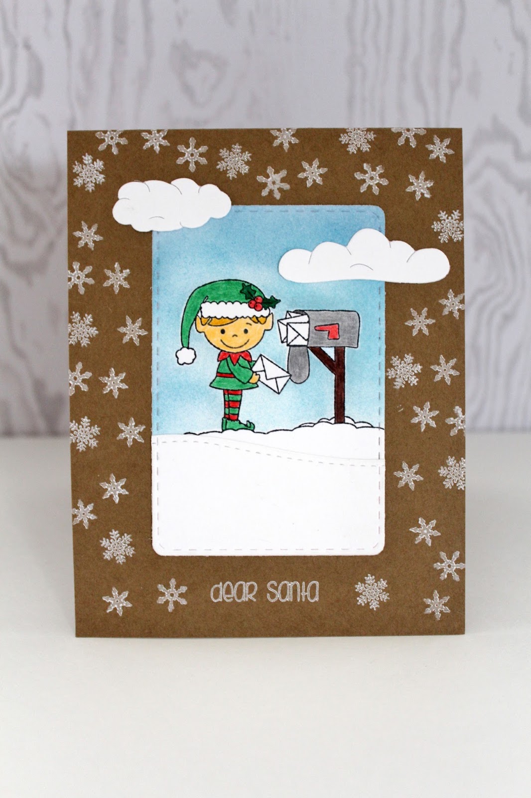 I wanted to create a fun scene using one of the elf images. The image is stamped onto white cardstock. I also stamped the same image onto a masking sheet. The image is cut out of the masking sheet and placed on top of the image on the cardstock. I used a distress ink to create the sky coloring. Once I was done, I peeled the masking piece off. The image is colored in using colored pencils. I also added a snowy hill below the image, using the Scalloped Waves dies. I also used the Stitched Rounded Rectangles die to cut out the scene. The scene is attached to a kraft card base. I also added a few clouds to add more detail to the scene. To fill in the empty space, I used the snowflakes from the Oh, Deer stamp set and stamped around the scene. A simple sentiment is stamped at the bottom of the card.