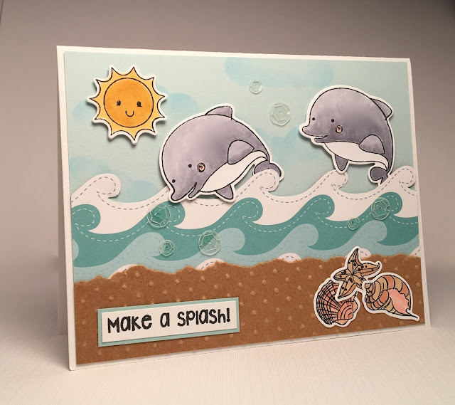 I was driving over the bridge to Hilton Head Island and saw a pod of dolphins chasing a boat.  They were having so much fun leaping and splashing in the water.  That was my inspiration for this card!