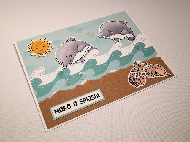 I was driving over the bridge to Hilton Head Island and saw a pod of dolphins chasing a boat.  They were having so much fun leaping and splashing in the water.  That was my inspiration for this card!