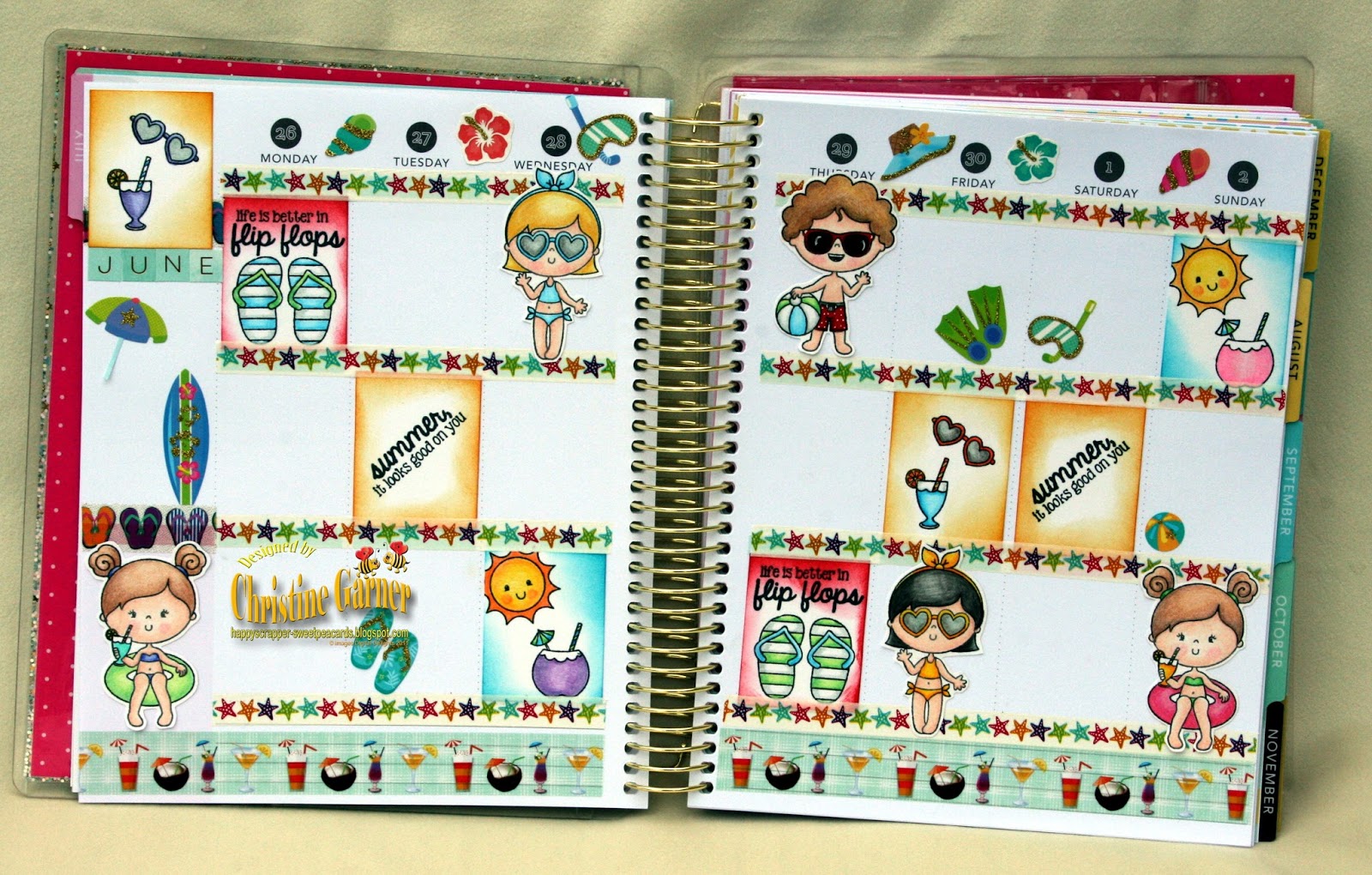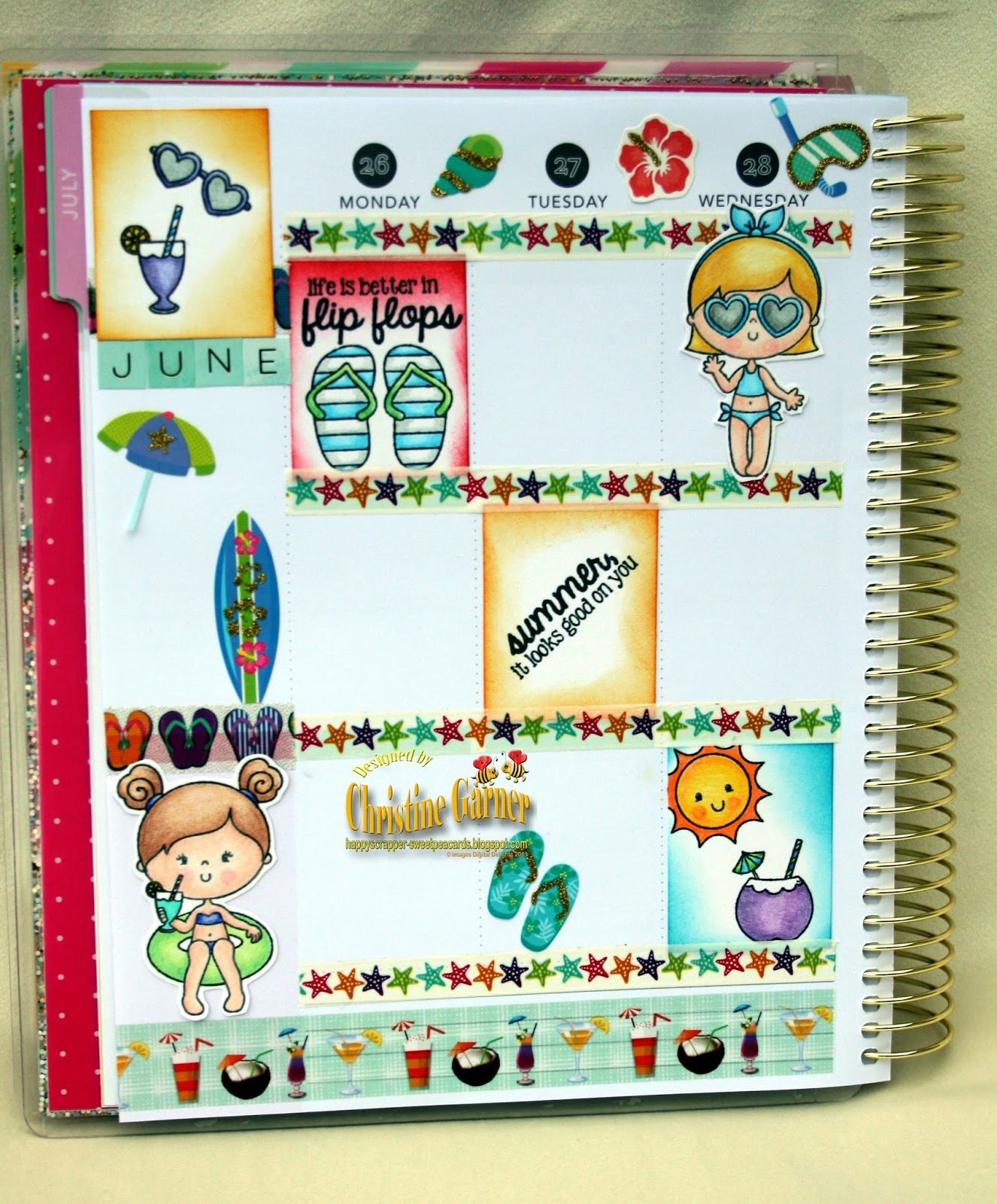I used my brand new Recollections Planner that starts this week. I used Distress Inks around my cut square papers. I stamped the images on these small panels to decorate with. I used these fabulous summer washi tape from my stash so decorate my spread also.