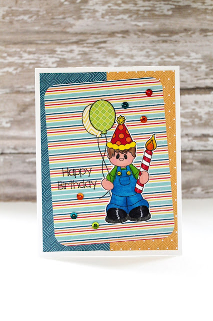 The birthday boy image is stamped and colored in with a variety of markers. The balloons for the same image are stamped on a couple of different prints. This was done to paper-piece the balloons. The boy and balloons are attached to a patterned backing. The corners of the backing are rounded. The card base mat is create with 2 different prints. To finish of the card, a few sequins are added to the card.