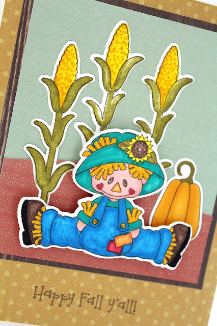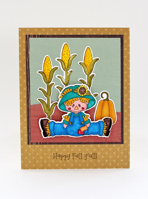 The images are stamped with brown ink. The next stamp is to color them in with a variety of markers. Line up the dies with the colored images and cut out the images. To start of the scene, I used the new Borders die to create the background hill. The cornstalks and pumpkin diecuts are added to the scene. The scarecrow is attached to the card with a foam dot. To finish the card, the sentiment is stamped at the bottom of the card.