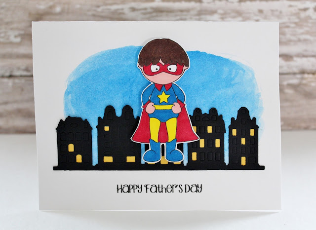 I stamped the superhero in black ink and colored in, with a variety of markers. The background was super easy to create. A blue watercolor is used to create the sky. (Please remember to use watercolor paper…unless you want it to warp…oops!) I used a skyline diecut with black cardstock. A few windows were popped out and some yellow cardstock added to the back. Attach the superhero and stamp a simple sentiment! Viola the card is finished!