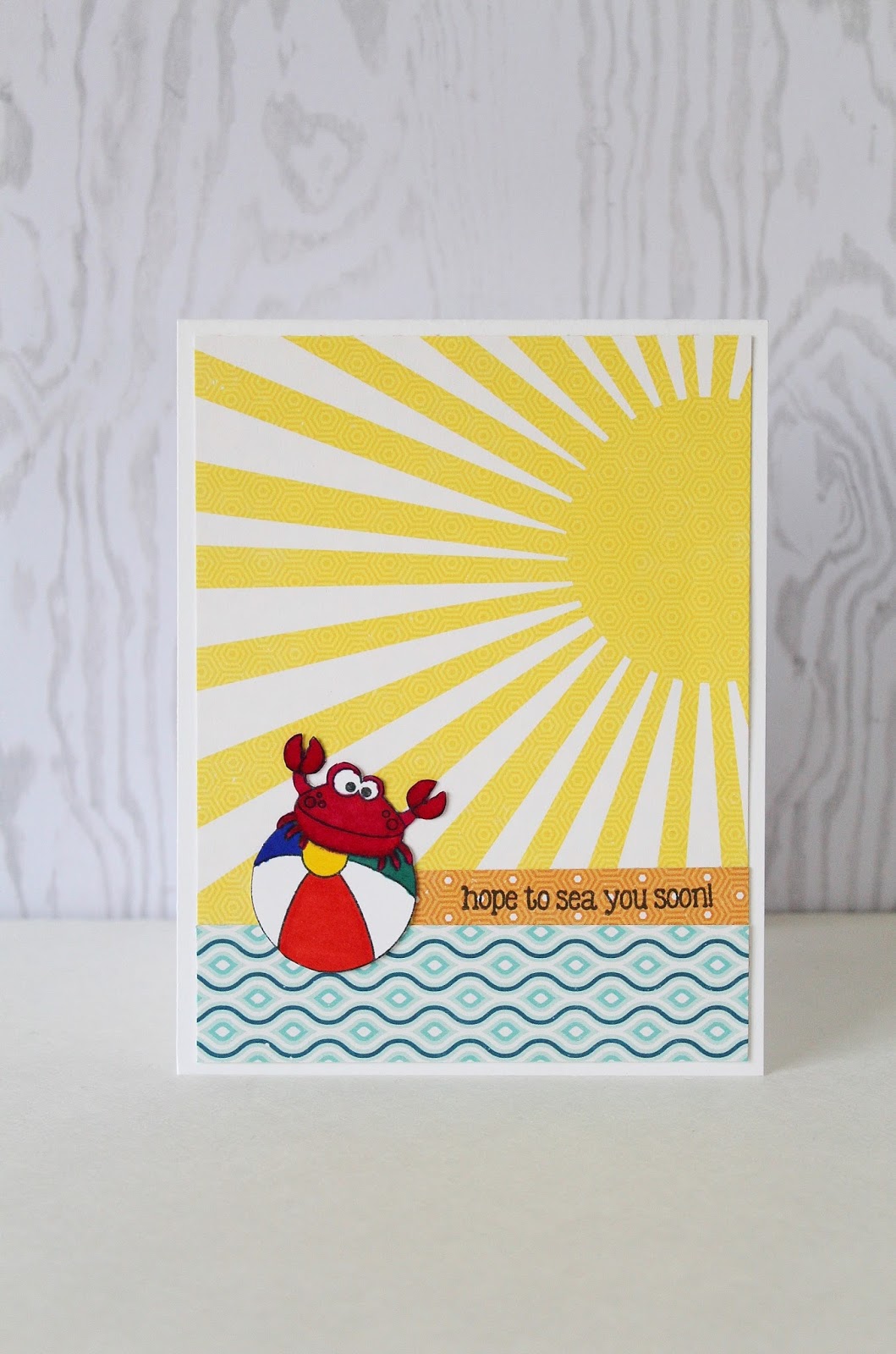 I found some fun summery prints and decided to create a scenery card. I placed the prints together and decided to stamp and color in the image. As I attached the crab to the card, I saw that it looked like the ball was drifting away in the water. The sentiment “hope to sea you soon” fits perfectly!