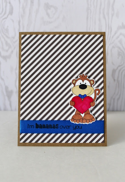 I created this CAS card using a simple printed paper, ribbon and the monkey image from the Go Bananas stamp set. The image is colored in with a variety of markers. The sentiment is stamped on a strip of satin ribbon. The ribbon is wrapped around the bottom of the card. The monkey is attached overlapping the ribbon.