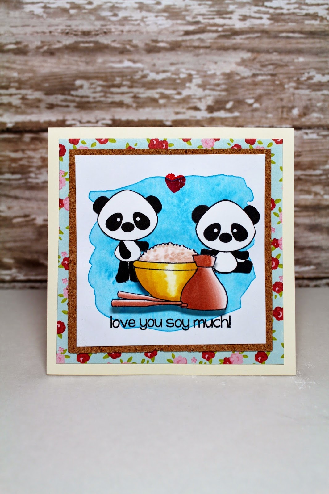The Pink & Main Stamp set used is the Pandamonium set. The bowl image is stamped, colored, and cut out. The pandas are stamped and cut out as well. On a piece of watercolor paper, the blue background is created using watercolors. Once the paint is dry, the pandas are added. Next, the bowl image is added using a foam dot to add dimension to the card. The simple heart and sentiment are added as final touches. It is time to piece all the layers (backing, cork, and picture) together.