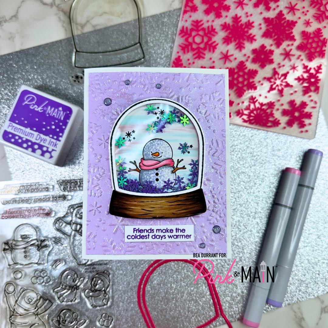 For her debut Challenge Team card, Bea created an adorable snow globe scene combining Empty Snow Globe stamps and dies with a cute little snowman from Flurry of Fun. We also love her Snow Day Embossing Folder in the background!