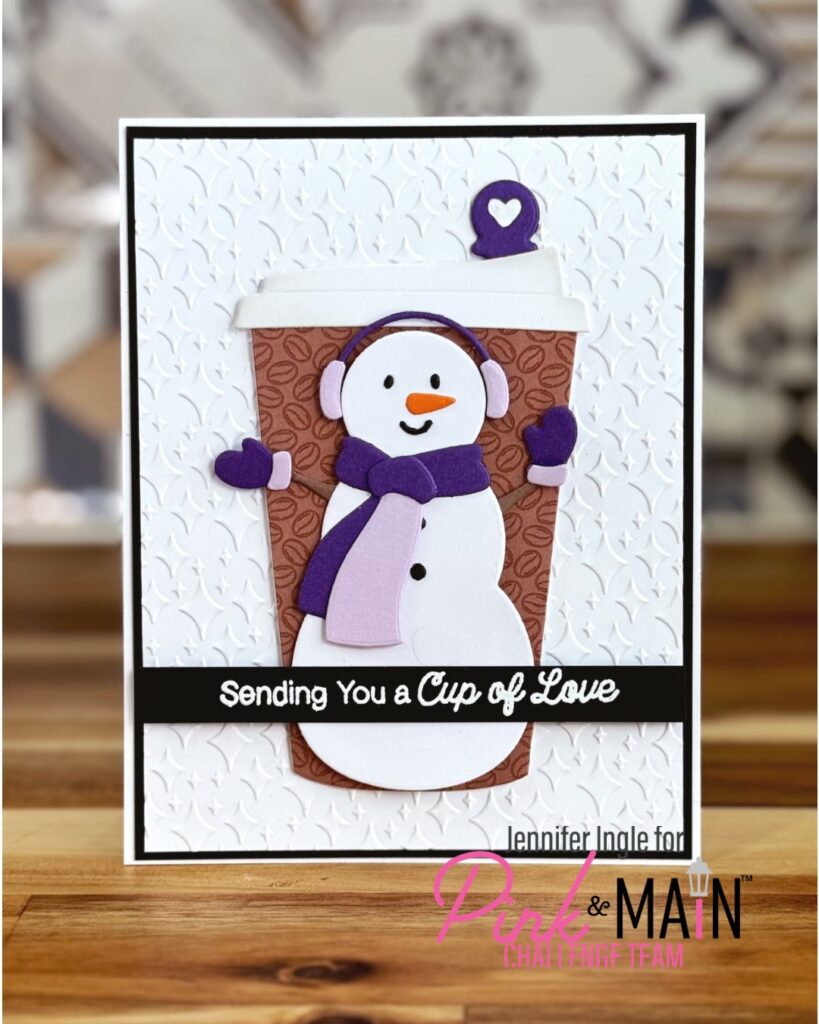 Jennifer created a hot drink decorated with a cold snowman! She combined the Hot Drink To Go die set with the Snowman Friend dies. And how fun is that Sparkles Embossing Folder background?