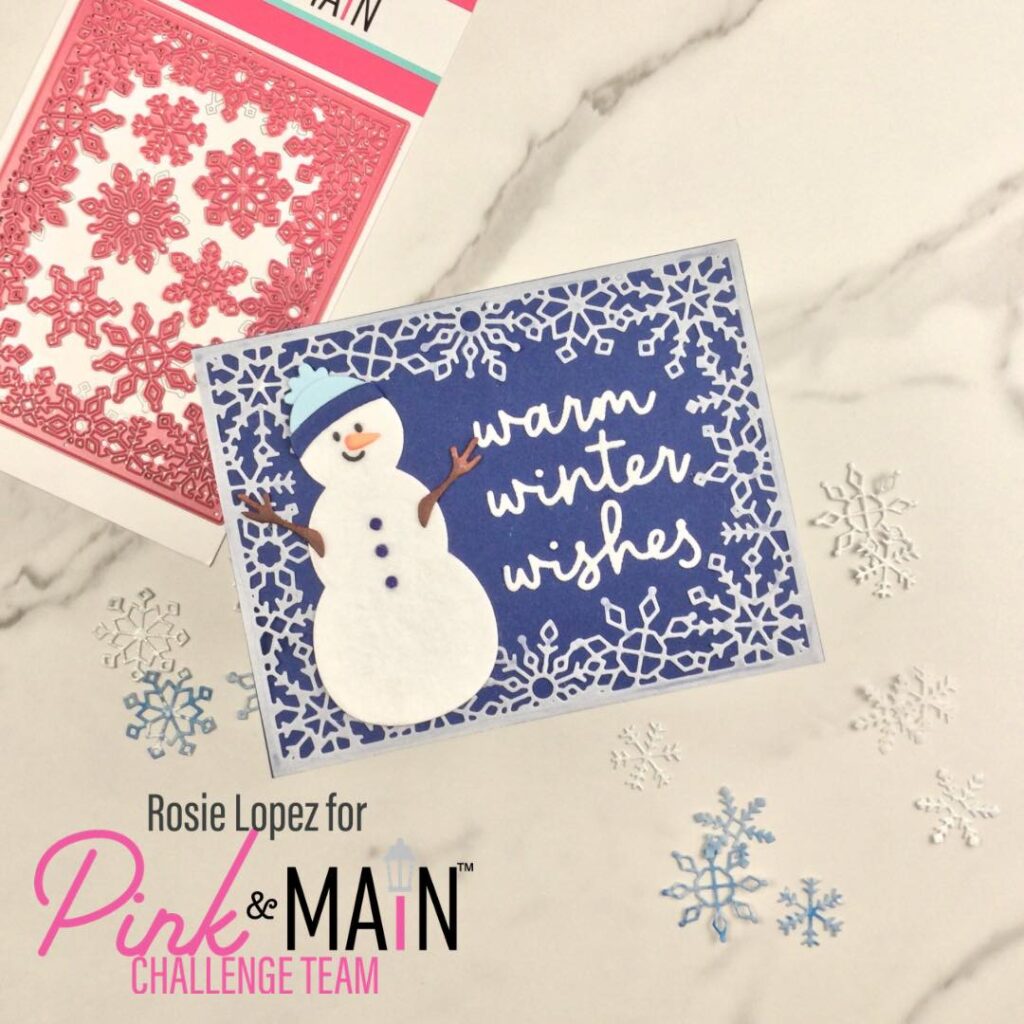 Rosie pulled our the gorgeous, delicate Snowflake Frame for her card. It’s a little hard to tell in the photo (card photos can be so hard!) but there’s Cotton Tail Flock on her Snowman Friend. That’s such a fun product to use on snowy creations!