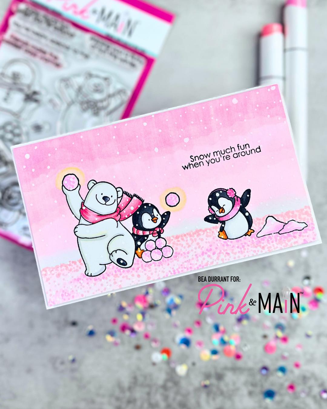 Bea’s sweet card is pretty in pink! She combined the Flurry of Fun stamp set with the gorgeous pink background she created!