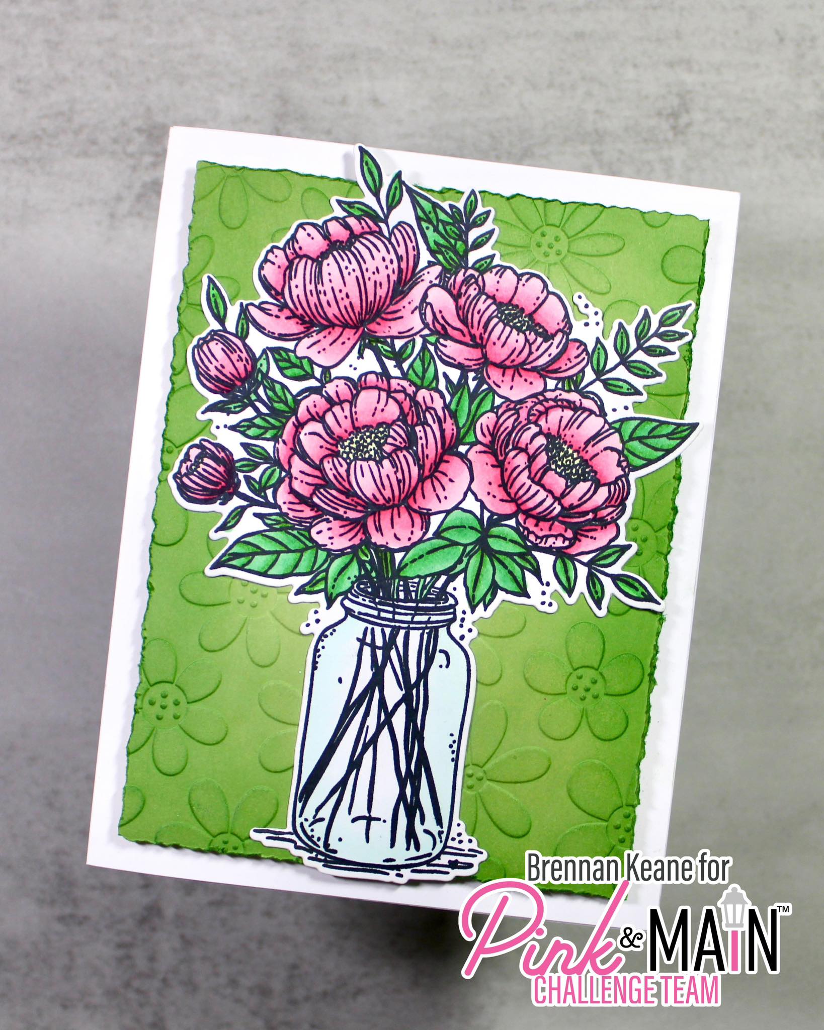 Brennan created a beautifully colored pink Jar of Peonies for his card this month. We love the green Pocket Full of Posies Embossing Folder in the background.