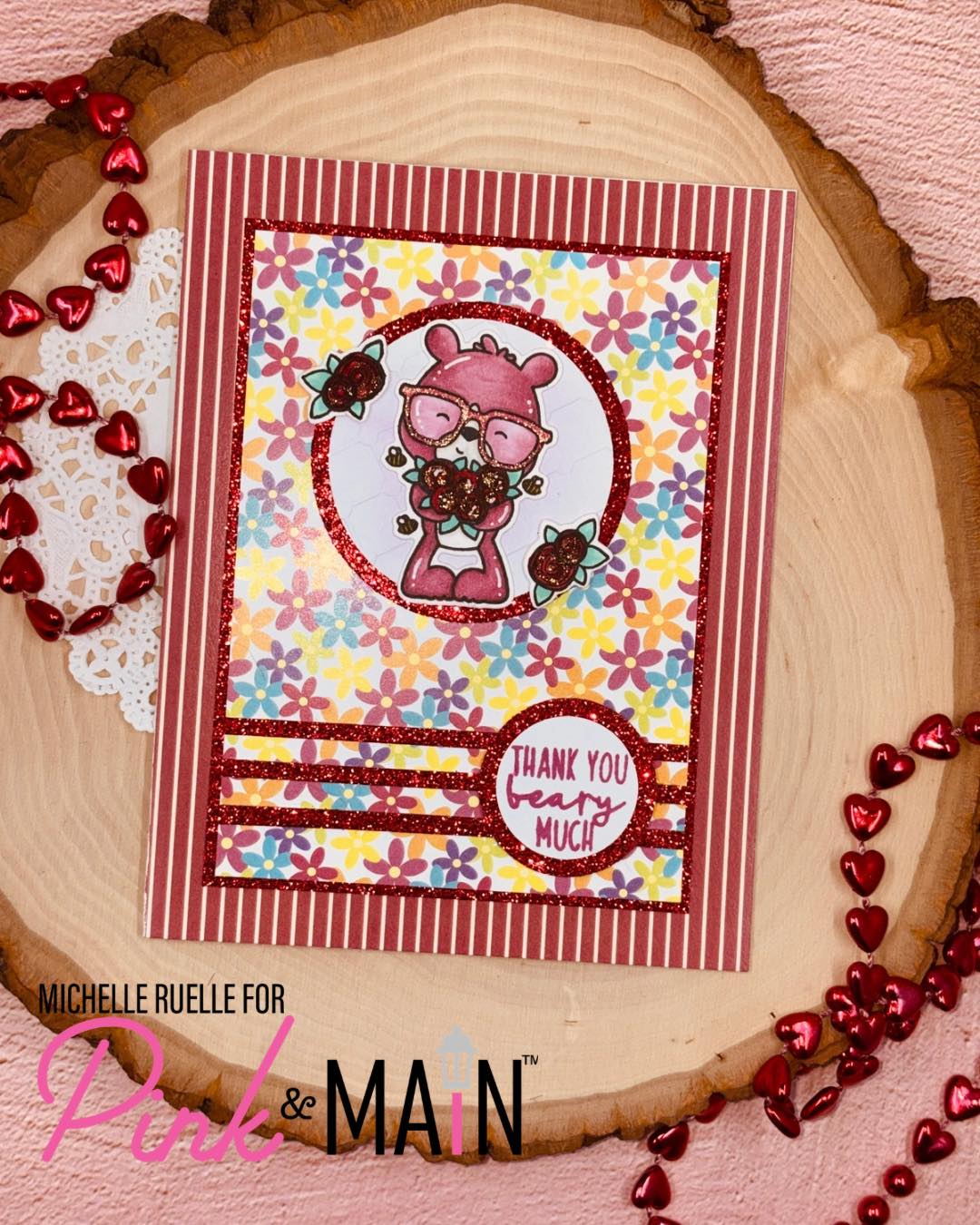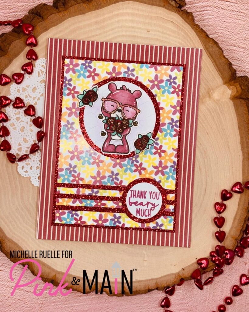 Michelle decided to pull in red glitter paper (from this pack) to kick off her cardmaking, then combined it with an adorable image from the Hap-Bee stamp set colored perfectly for the challenge!