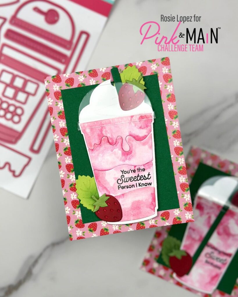 Rosie made a Cool Drink To Go that looks absolutely delicious! She embellished with some strawberries from the Berry Pop Up Card Dies set, added a message from Berry Happy, and matted it all on the perfect paper from the Bugs & Berries pack. So fun!