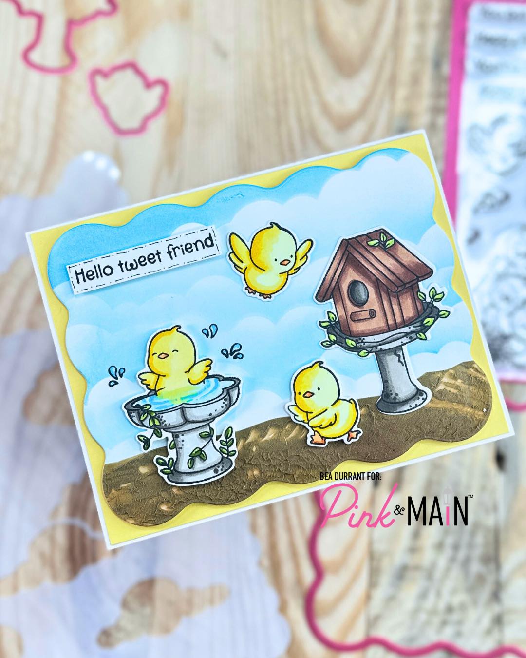 Bea created this adorable card with the Chirp Chirp Hooray stamp set. Her texture is the fun tinted paste she used to ground her scene.