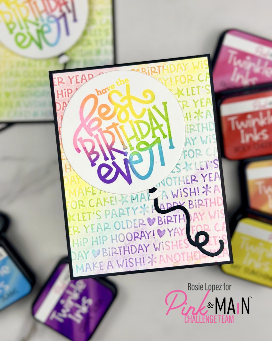 Rosie used the Birthday Wishes Embossing Folder with watercolor paper for deep texture and then highlighted that texture with the Twinkle Inks.