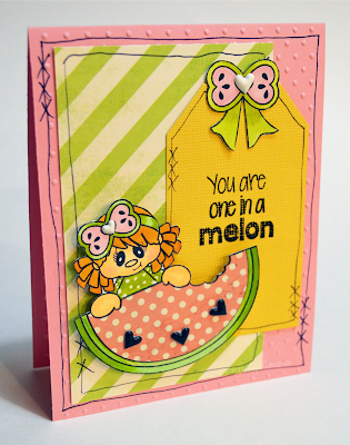 I’ve been wanting to play with this cutie, but just now got around to it.  I love her hair too.  I colored her with Spectrum Noir markers and paper pieced the watermelon.  I masked off the seeds and added black puffy hearts instead.  I masked off the tag and stacked the sentiment.  Oh and I’m loving the matching bow too.  You can find Melon here.