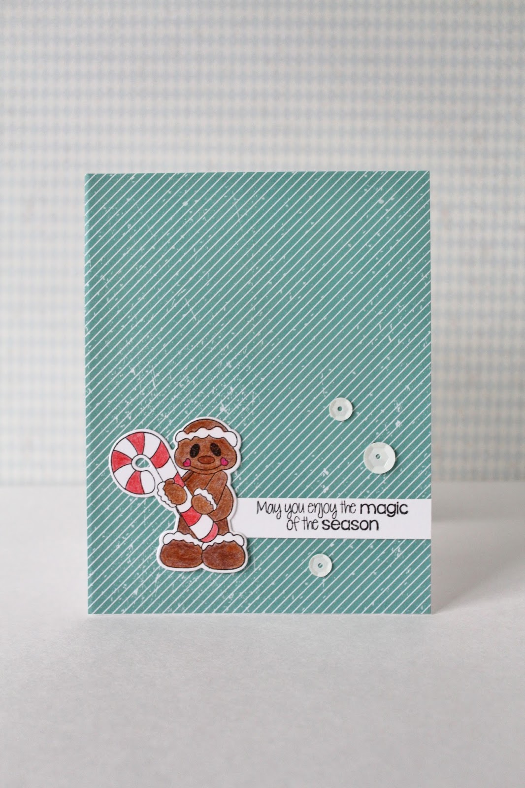 I decided to take out my colored pencils to color in the gingerbread image today. Once the image is colored in, I used the coordinating die to cut the image out. The gingerbread is paired up with a sweet sentiment, stamped onto a strip of cardstock. I felt the card needed something else. I decided to add a few white sequins to the card.