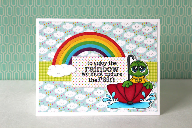 The image from the Rain Frogs stamp set is stamped in black ink onto white cardstock. The image is colored in with a variety of markers. The image is then fussy-cut. I used some fun prints to make the background of the card. The rainbow is made from a few different cardstocks and a rainbow die. The sentiment is stamped onto a different print.