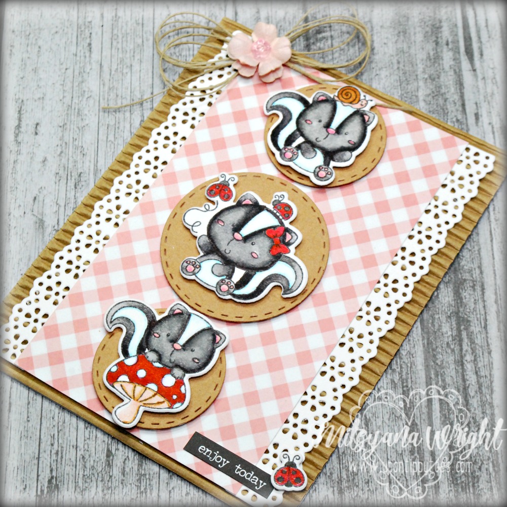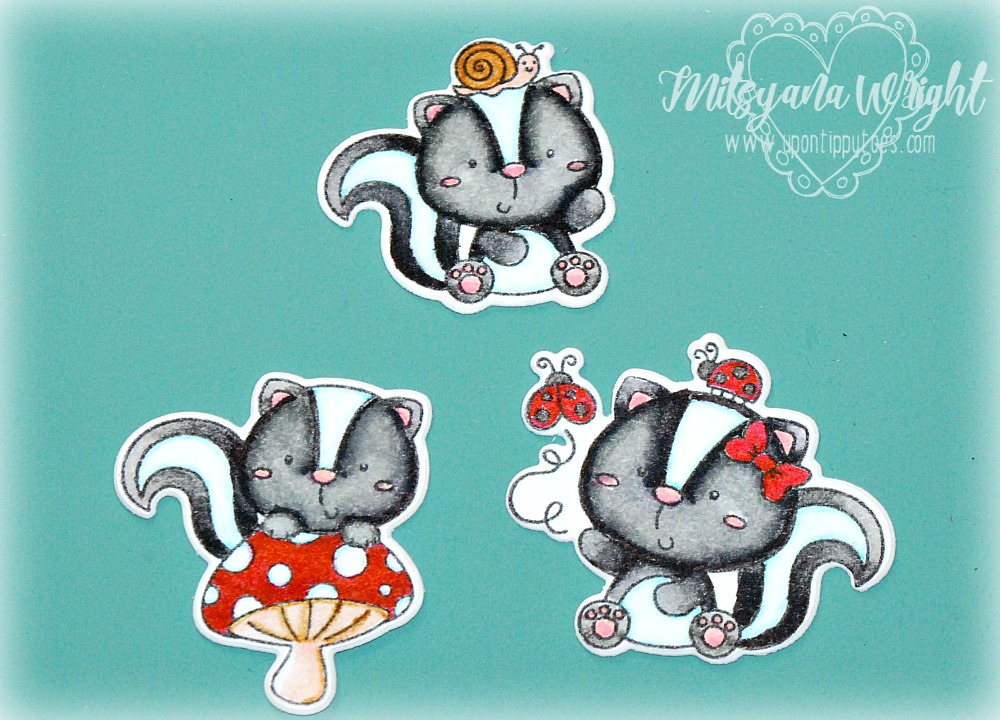 When I first got this stamp set I was so excited to use it I got my stamps out, stamped out a few images, got out my markers and water brush, and started going to town. Before I knew it I had colored my images with black ink running down the middle of their heads. I only realized after, what I had believed to be the third “skunk” image, it wasn’t quite looking right.