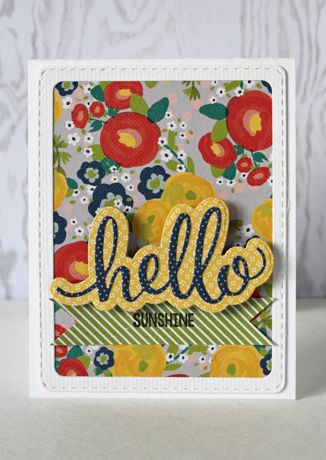 I am in love with the new rounded rectangle dies from Pink & Main. I used two of them to create the white frame. I placed a beautiful print under the frame. I paired two different prints with the new “Hello” word and shadow dies. I created a simple banner with a different print and stamped the rest of the sentiment.