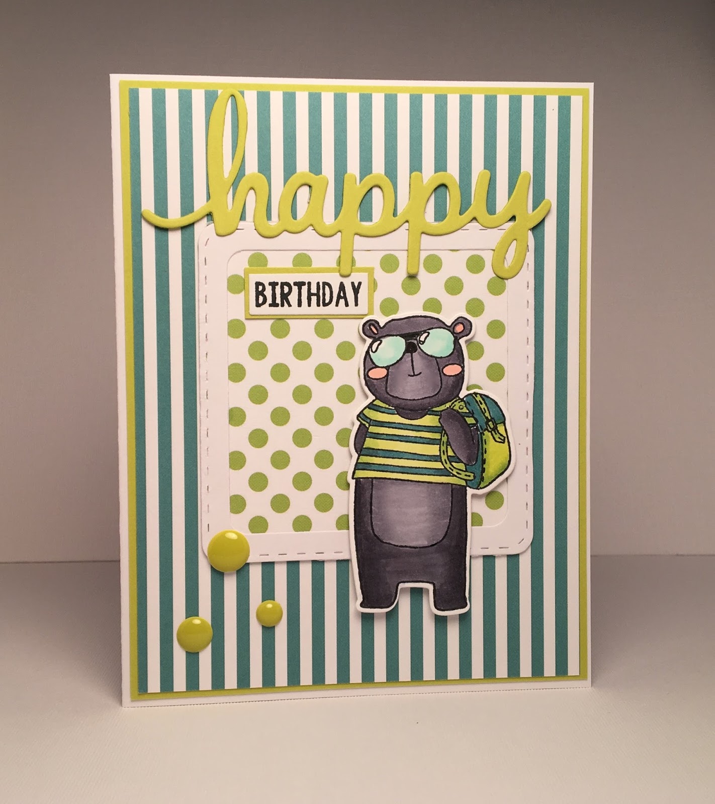 5. Stamp the little bear using the Too Cool stamp set and color with copic markers: G00 – BG18, 75 – YG21, 23 – C3, 4, 5, 6, 7.