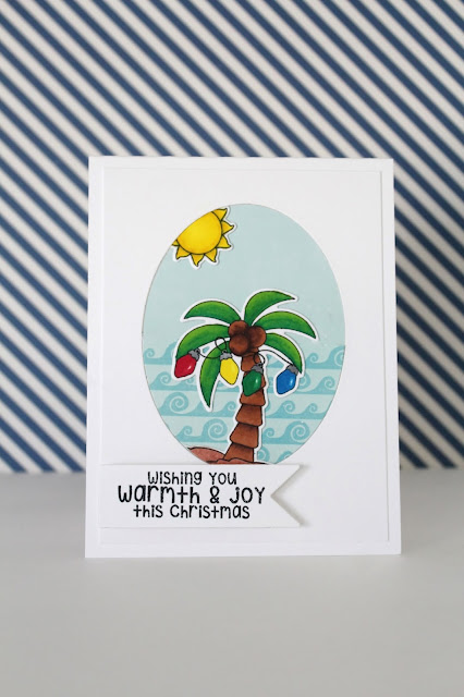 I really wanted to highlight the palm tree. To do so, I created the oval scene and placed on a solid white card. I had a piece of the patterned paper that had waves on one side and a light blue on the other side. I cut the oval in half and flipped over one side to create the water/sky. The palm tree is stamped on cardstock and colored in. Once I finished with the coloring, I lined up the die and cut the image out. The top of the oval was a little empty, so I decided to add the sun. The fun sentiment is stamped onto a banner diecut and added with a foam dot.