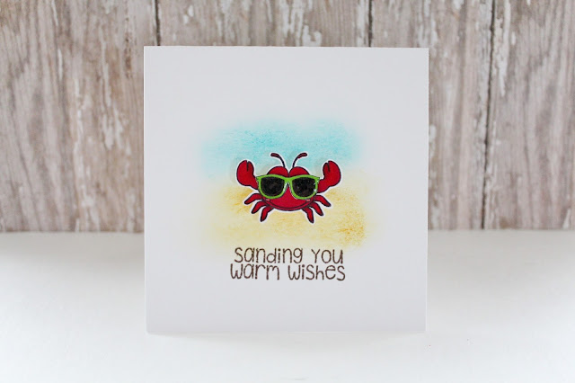 The crab is colored in with a variety of markers. Once the coloring was finished, I cut out the image and set aside. To create the background on the card, I used ink and blended them onto the cardstock. I attached the crab to the card. This was my original plan for the card. However, I felt that it needed something else! So I took the sunglasses image from the Tickled Pink set. Once the image was colored, I added glossy accents to the glasses. To finish the card, I attached the glasses and stamped the simple sentiment!